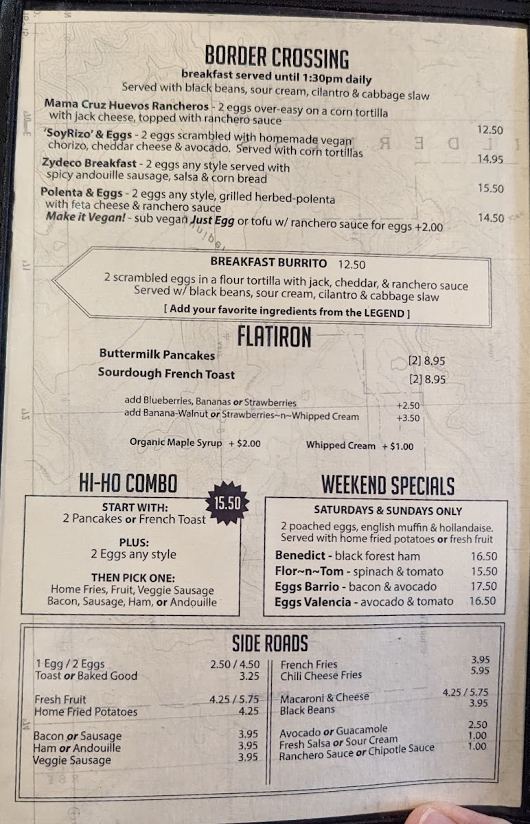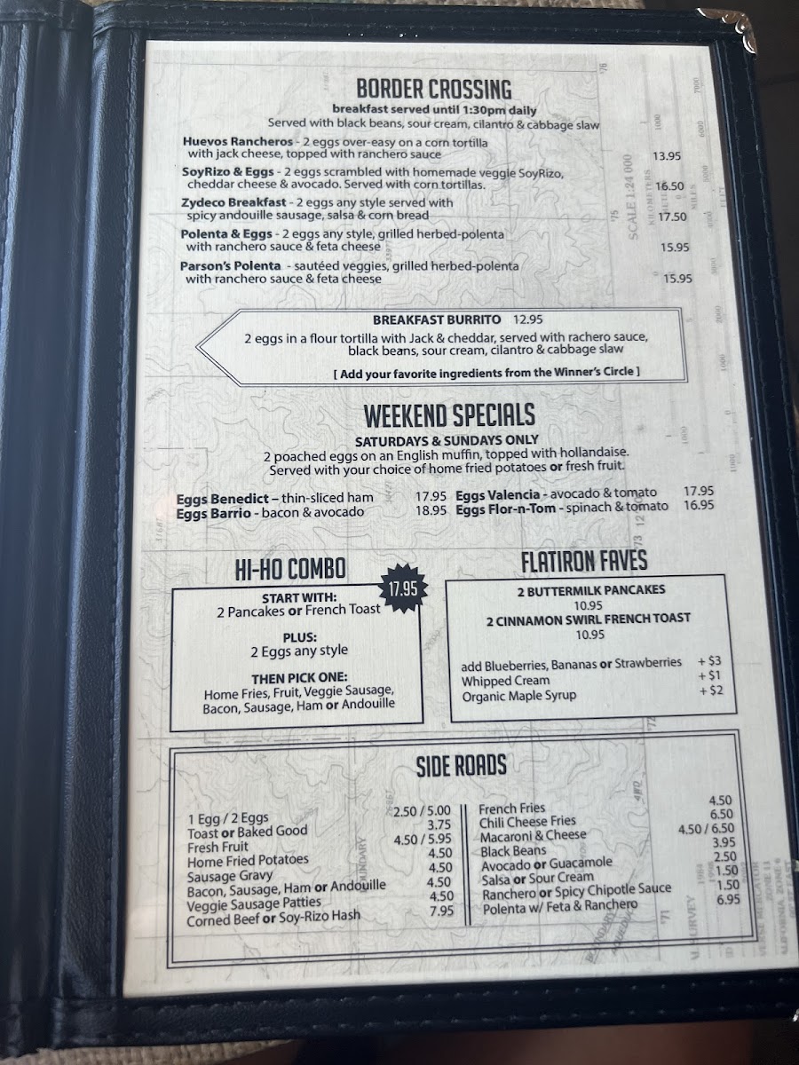 - Pancakes and French Toast: Features buttermilk hotcakes, sourdough French toast, and variations such as bacon-cheddar pancakes and fruit-topped options.
